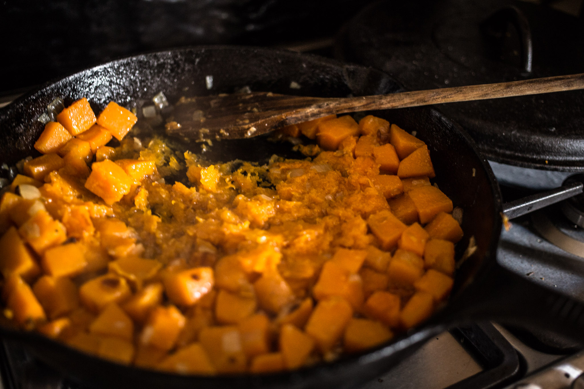 - Cover with a lid and leave on a low flame (or medium-low heat), stirring every five minutes or so with a wooden spoon until the Butternut Squash is soft enough to mash. (It took about 50 minutes for me). Add Salt, Pepper and a pinch of Cinnamon and use your spoon to mash everything into a smooth filling. Set aside and allow to cool down while you make the dough.
